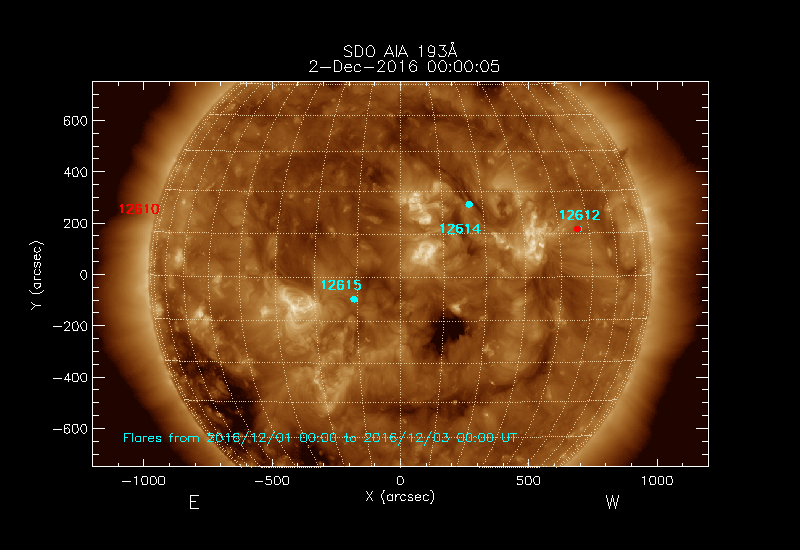 The most recent flares (≤12 hours) are shown as red dots, 12-24 hours ago as blue dots and older ones as turquoise dots.