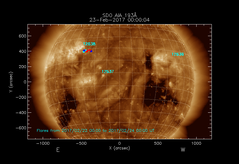 The most recent flares (≤12 hours) are shown as red dots, 12-24 hours ago as blue dots and older ones as turquoise dots.