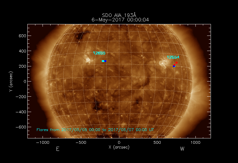 The most recent flares (≤12 hours) are shown as red dots, 12-24 hours ago as blue dots and older ones as turquoise dots.