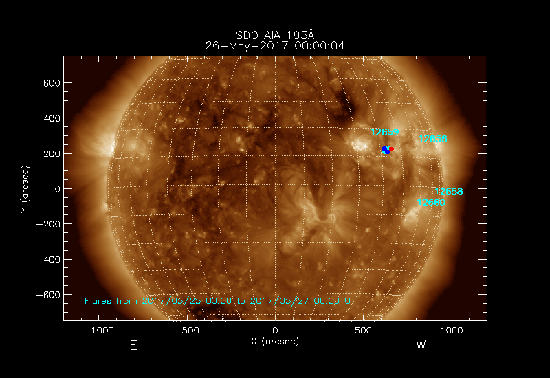 The most recent flares (≤12 hours) are shown as red dots, 12-24 hours ago as blue dots and older ones as turquoise dots.