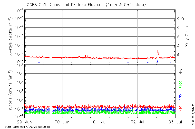 This page provides light-curves generated from GOES soft X-ray and Particle data for the date indicated at the top and the preceding three days.