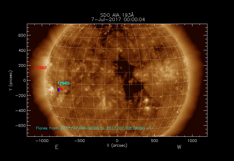 The locations of the flares over-plotted on the image are derived from the flare catalogue