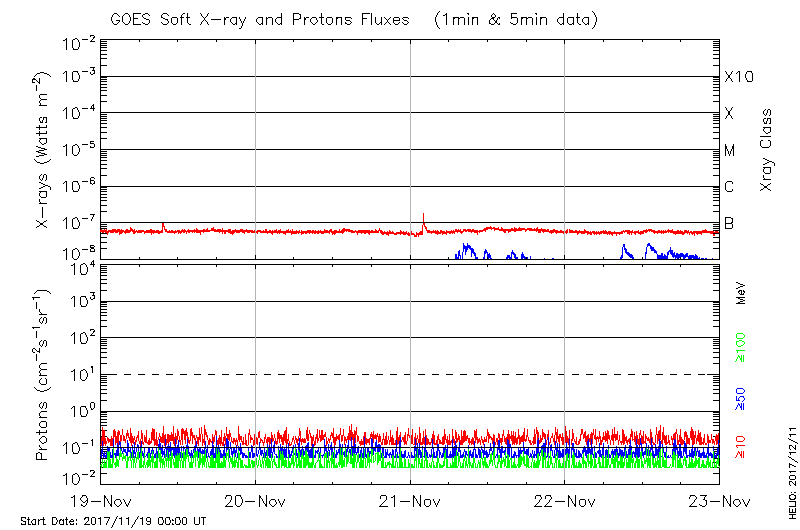 This page provides light-curves generated from GOES soft X-ray and Particle data for the date indicated at the top and the preceding three days.