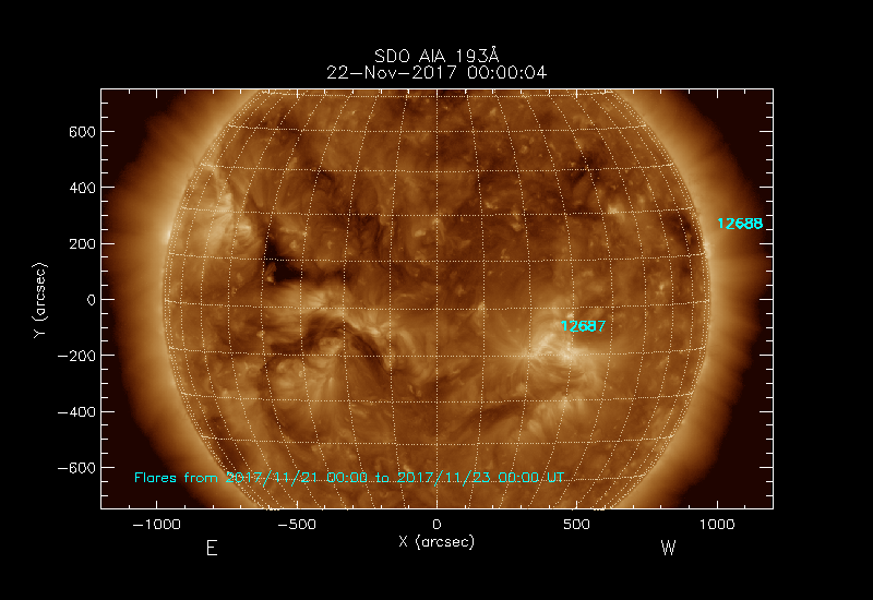 Click on an Active Region plot to display the Region Report including the region evolution and flaring history. HEC Search for NOAA Active Regions (SRS) records for this date and the day before.