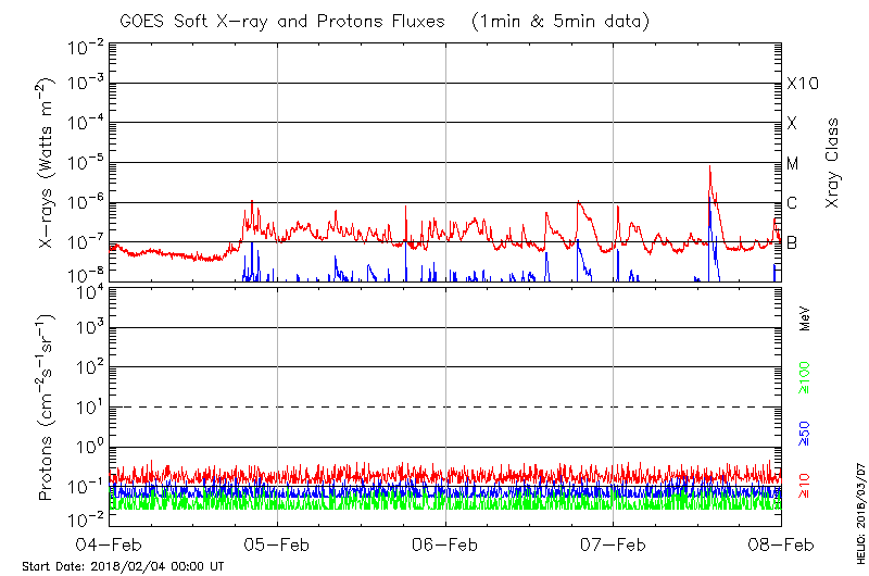 This page provides light-curves generated from GOES soft X-ray and Particle data for the date indicated at the top and the preceding three days.