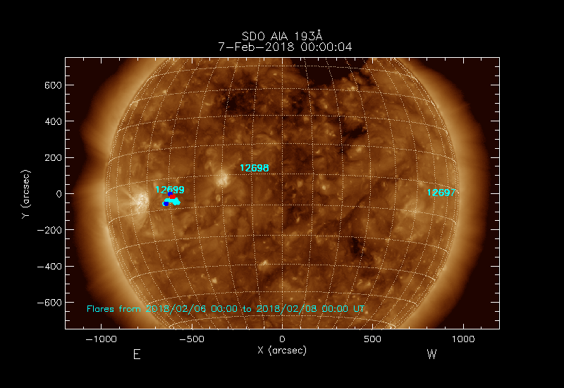 Click on an Active Region plot to display the Region Report including the region evolution and flaring history. HEC Search for NOAA Active Regions (SRS) records for this date and the day before.