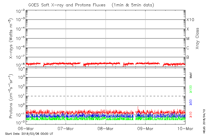 This page provides light-curves generated from GOES soft X-ray and Particle data for the date indicated at the top and the preceding three days.