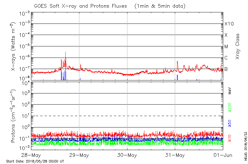 This page provides light-curves generated from GOES soft X-ray and Particle data for the date indicated at the top and the preceding three days.