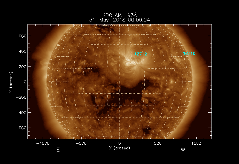 Click on an Active Region plot to display the Region Report including the region evolution and flaring history. HEC Search for NOAA Active Regions (SRS) records for this date and the day before.