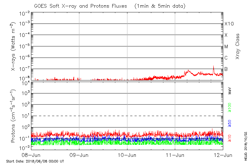 This page provides light-curves generated from GOES soft X-ray and Particle data for the date indicated at the top and the preceding three days.