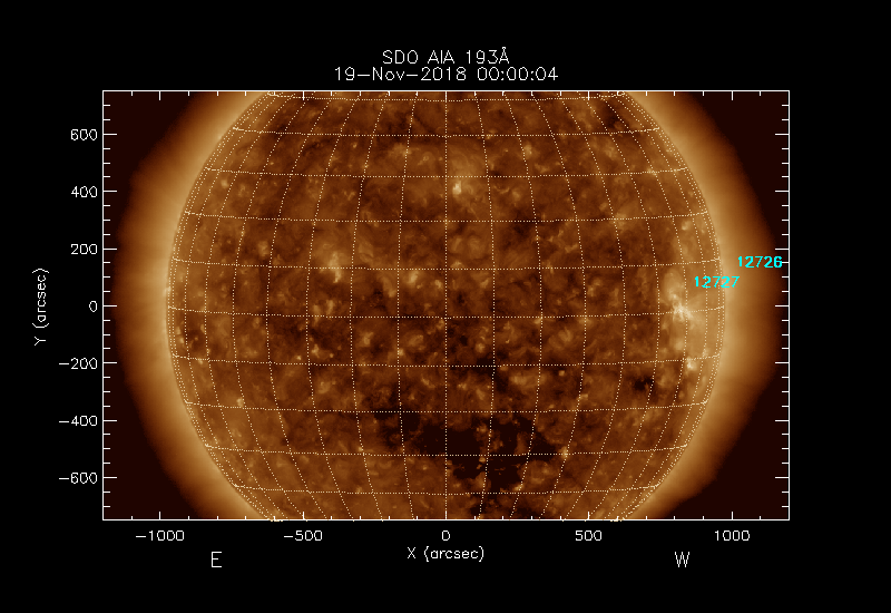 Click on an Active Region plot to display the Region Report including the region evolution and flaring history. HEC Search for NOAA Active Regions (SRS) records for this date and the day before.