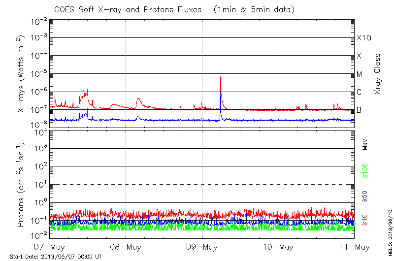 This page provides light-curves generated from GOES soft X-ray and Particle data for the date indicated at the top and the preceding three days.