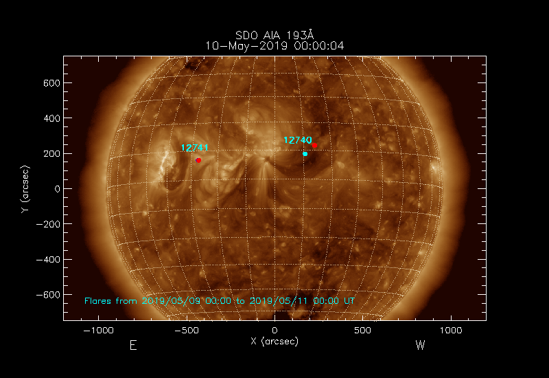 The most recent flares (≤12 hours) are shown as red dots, 12-24 hours as blue