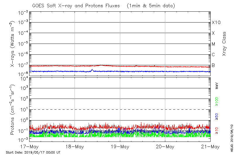 This page provides light-curves generated from GOES soft X-ray and Particle data for the date indicated at the top and the preceding three days.