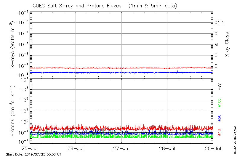 This page provides light-curves generated from GOES soft X-ray and Particle data for the date indicated at the top and the preceding three days.