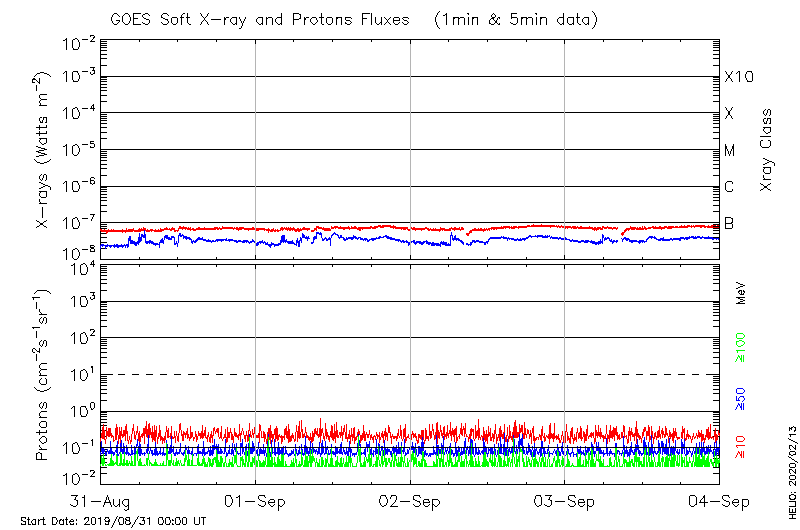 This page provides light-curves generated from GOES soft X-ray and Particle data for the date indicated at the top and the preceding three days.