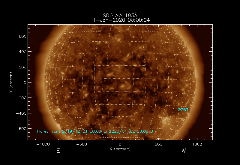 The locations of the flares over-plotted on the image are derived from the flare catalogue