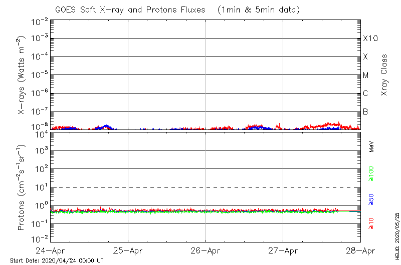 This page provides light-curves generated from GOES soft X-ray and Particle data for the date indicated at the top and the preceding three days.