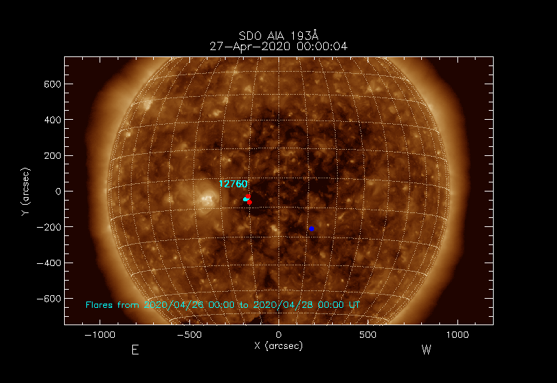 The most recent flares (≤12 hours) are shown as red dots, 12-24 hours as blue