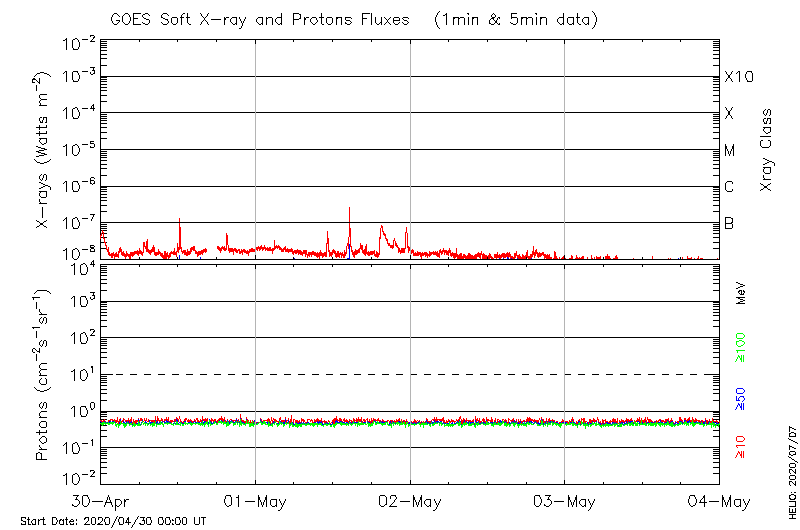 This page provides light-curves generated from GOES soft X-ray and Particle data for the date indicated at the top and the preceding three days.