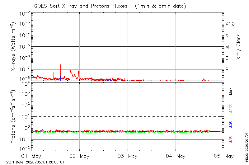 This page provides light-curves generated from GOES soft X-ray and Particle data for the date indicated at the top and the preceding three days.