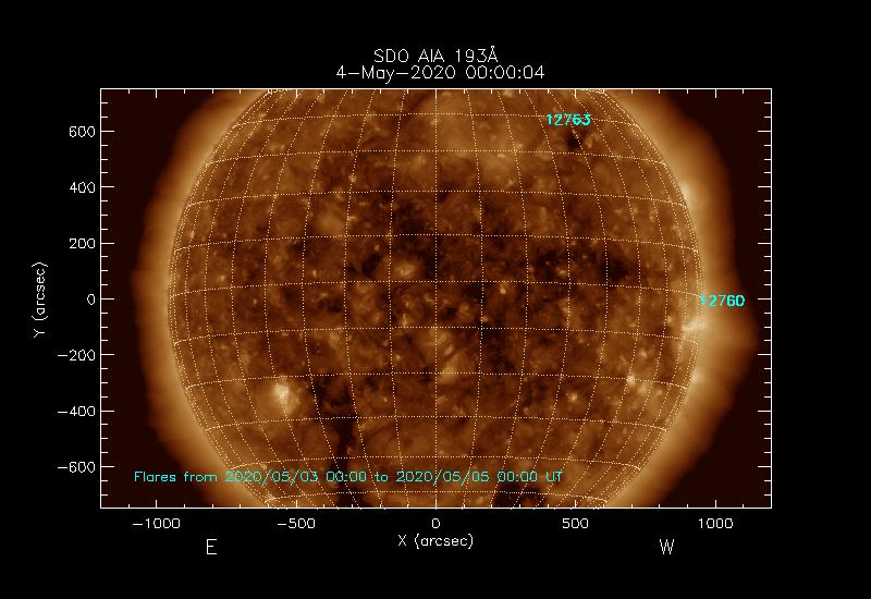 Click on an Active Region plot to display the Region Report including the region evolution and flaring history. HEC Search for NOAA Active Regions (SRS) records for this date and the day before.