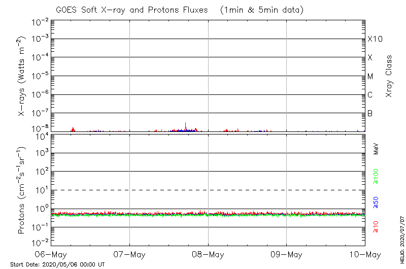 This page provides light-curves generated from GOES soft X-ray and Particle data for the date indicated at the top and the preceding three days.