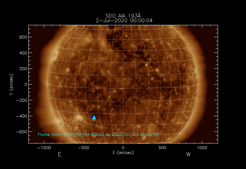 The locations of the flares over-plotted on the image are derived from the flare catalogue