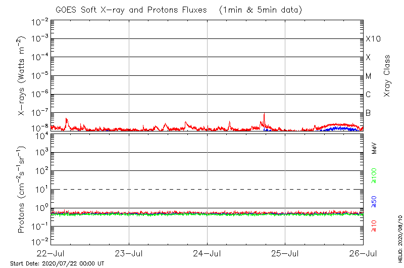 This page provides light-curves generated from GOES soft X-ray and Particle data for the date indicated at the top and the preceding three days.