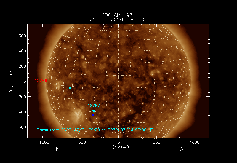 Click on an Active Region plot to display the Region Report including the region evolution and flaring history. HEC Search for NOAA Active Regions (SRS) records for this date and the day before.
