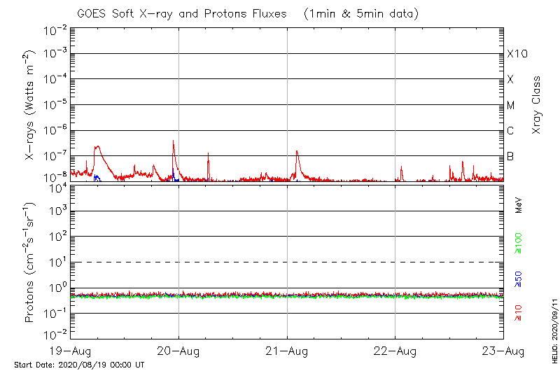 This page provides light-curves generated from GOES soft X-ray and Particle data for the date indicated at the top and the preceding three days.