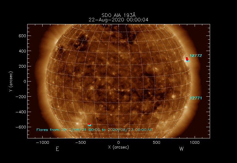 The most recent flares (≤12 hours) are shown as red dots, 12-24 hours ago as blue dots and older ones as turquoise dots.