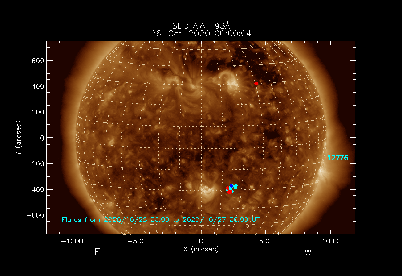 The most recent flares (≤12 hours) are shown as red dots, 12-24 hours ago as blue dots and older ones as turquoise dots.