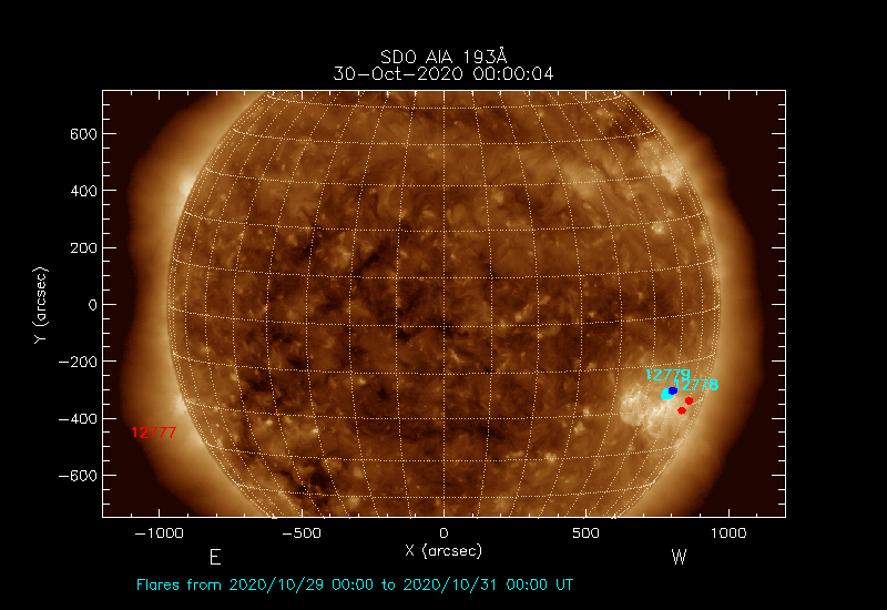 The most recent flares (≤12 hours) are shown as red dots, 12-24 hours ago as blue dots and older ones as turquoise dots.