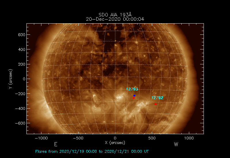 The most recent flares (≤12 hours) are shown as red dots, 12-24 hours ago as blue dots and older ones as turquoise dots.
