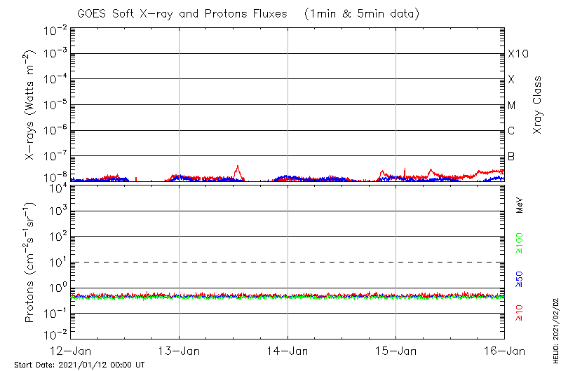 This page provides light-curves generated from GOES soft X-ray and Particle data for the date indicated at the top and the preceding three days.
