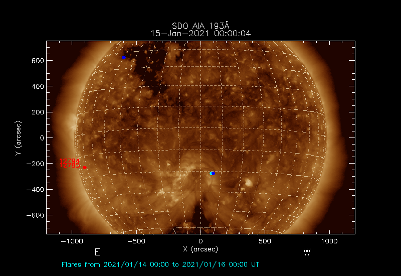 The most recent flares (≤12 hours) are shown as red dots, 12-24 hours ago as blue dots and older ones as turquoise dots.