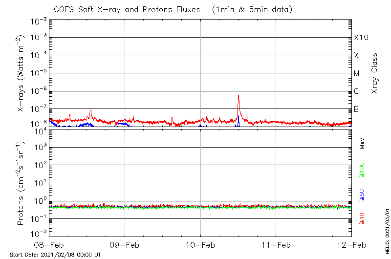 This page provides light-curves generated from GOES soft X-ray and Particle data for the date indicated at the top and the preceding three days.