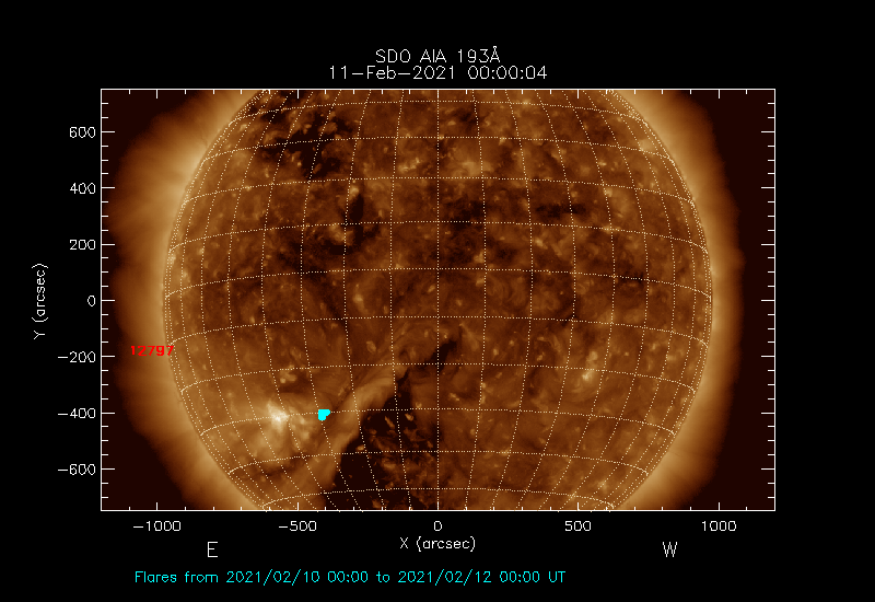 Click on an Active Region plot to display the Region Report including the region evolution and flaring history. HEC Search for NOAA Active Regions (SRS) records for this date and the day before.