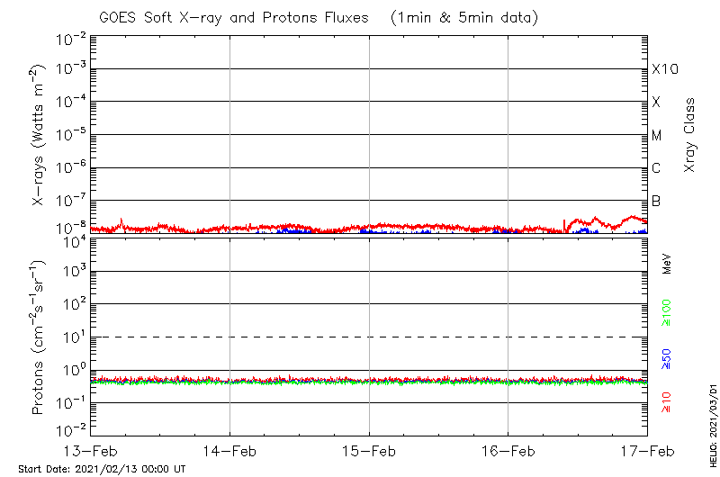 This page provides light-curves generated from GOES soft X-ray and Particle data for the date indicated at the top and the preceding three days. The designated date is the right most panel; the locations shown on the Flare Locations page are covered in the two right hand panels.