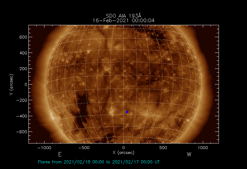 An image is created every 6 hours using the closest available FITS file to this time that can be found. The time interval coverered by the image is indicated in the bottom left hand corner. Flares for the 48 hours leading up to the time are over-plotted; these are rotated to the time of the FITS image.