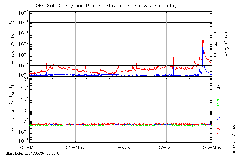 This page provides light-curves generated from GOES soft X-ray and Particle data for the date indicated at the top and the preceding three days.