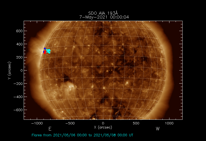 The most recent flares (≤12 hours) are shown as red dots, 12-24 hours ago as blue dots and older ones as turquoise dots.