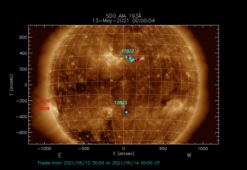 The most recent flares (≤12 hours) are shown as red dots, 12-24 hours ago as blue dots and older ones as turquoise dots.