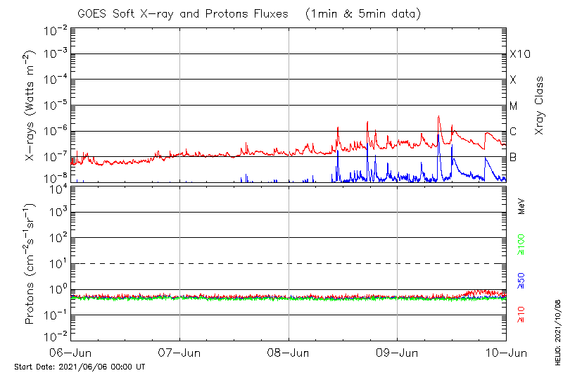 This page provides light-curves generated from GOES soft X-ray and Particle data for the date indicated at the top and the preceding three days.