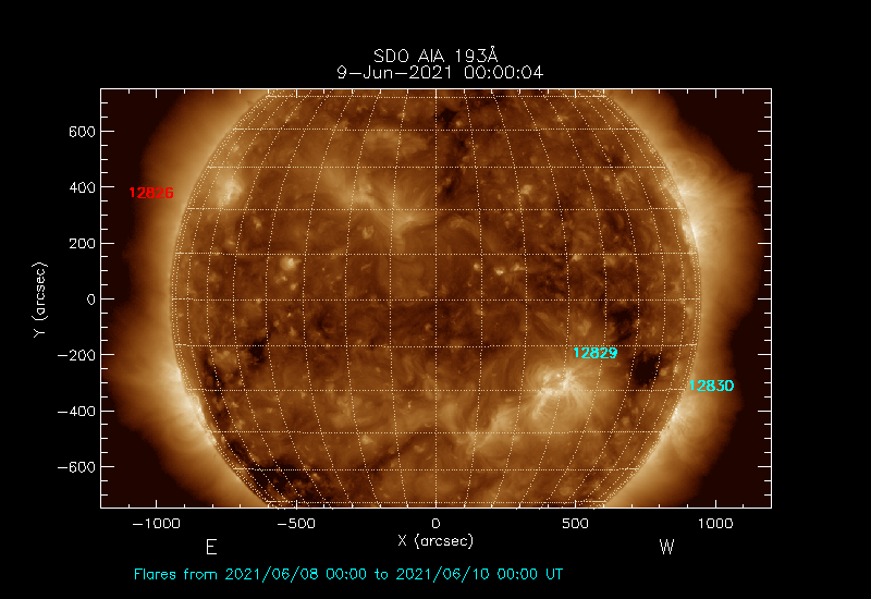 Click on an Active Region plot to display the Region Report including the region evolution and flaring history. HEC Search for NOAA Active Regions (SRS) records for this date and the day before.
