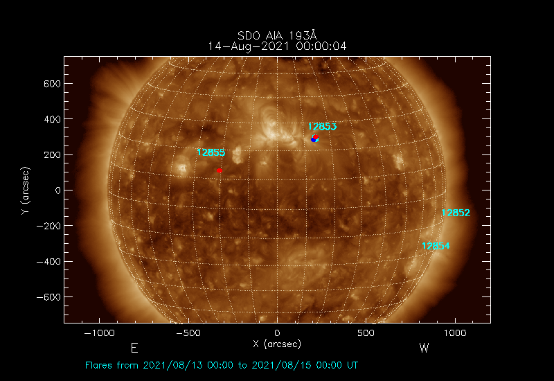 The most recent flares (≤12 hours) are shown as red dots, 12-24 hours ago as blue dots and older ones as turquoise dots.