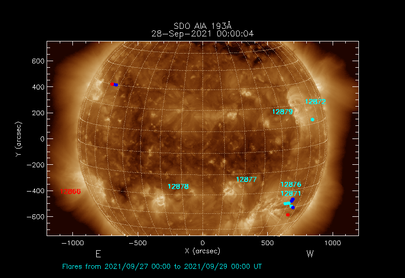 The most recent flares (≤12 hours) are shown as red dots, 12-24 hours ago as blue dots and older ones as turquoise dots.