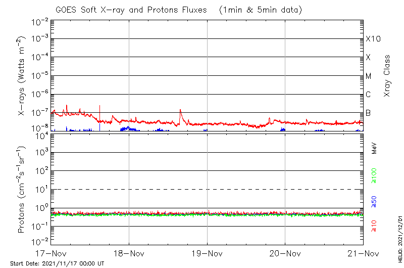 This page provides light-curves generated from GOES soft X-ray and Particle data for the date indicated at the top and the preceding three days.