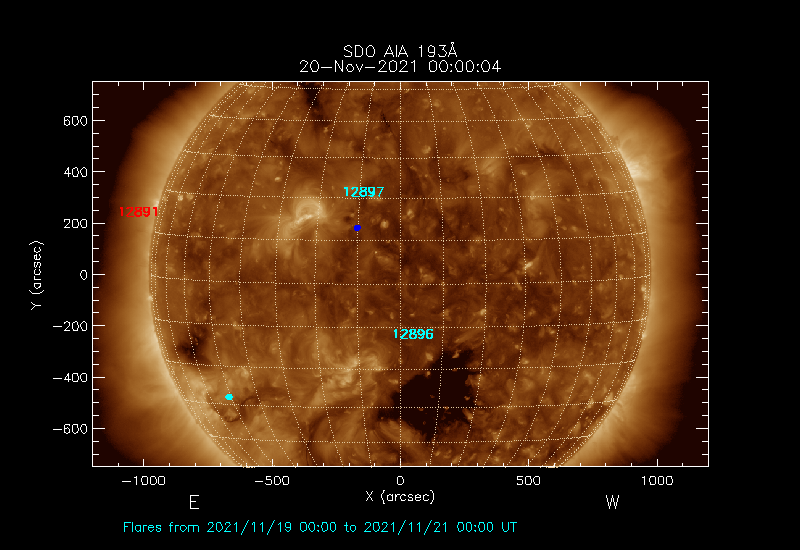 Click on an Active Region plot to display the Region Report including the region evolution and flaring history. HEC Search for NOAA Active Regions (SRS) records for this date and the day before.
